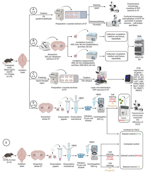 For immunohistochemical studies, the brains of some transgenic mice (n = 4) were isolated and frozen according to the previously described method [36,41]. Other transgenic mice (n = 25) were decapitated under anesthesia with 2.4% isoflurane (Baxter, Deerfield, IL, USA), and the brain was removed. The dissected dorsal striatum of these animals was used for ex vivo experiments (incubation of striatal vibratome sections), as well as to obtain a fraction of GFP neurons from the total cell suspension of the striatum and to isolate individual GFP neurons from striatal sections using laser microdissection (Figure 8). Along with transgenic mice, C57BL/6 mice were used. After decapitation of these animals under isoflurane anesthesia, a cell suspension was obtained from the striatum. Biological samples obtained after the incubation of vibratome sections were further analyzed by high-performance liquid chromatography with electrochemical detection and PCR.