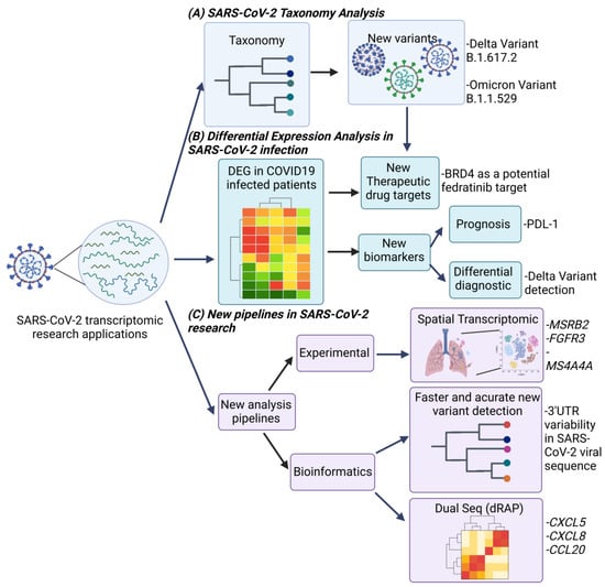 Research applications of SARS-CoV-2 viral infection using transcriptome analysis. Analysis of the transcriptome of viral infection by SARS-CoV-2 has focused primarily on three areas: (A) the investigation of the biological nature and taxonomy of the virus. The study of taxonomy has focused primarily on the characterization of the SARS-CoV-2 genome and the mutations it presents, which has led to the identification of new variants of the virus. (B) Analysis of differentially expressed genes in patients with COVID-19 infection. Analysis of the transcriptome of patients who are hosts of this virus has allowed the identification of differentially expressed genes that deregulate the intracellular signaling pathways involved in infection and viral pathogenesis, as well as their relationship with the presence of variants of the virus, which, together with the characterization of variants, has allowed the identification of new therapeutic targets, as well as new molecular diagnostic biomarkers, which may be useful in the prognosis of patients with severe disease and differential diagnosis of the variants of the virus, as well as the distinction of respiratory pathologies of different etiologies. (C) The development of new methodologies for transcriptome analysis. To optimize research in these areas, new experimental strategies have been developed that allow for obtaining more information about viral pathogenesis such as spatial transcriptomics, as well as new bioinformatics strategies such as the development of new workflows that optimize the detection of variants during sequencing, as well as the joint analysis of the host transcriptome and the virus by Dual-Seq, which optimizes resources for the study of SARS-CoV-2.