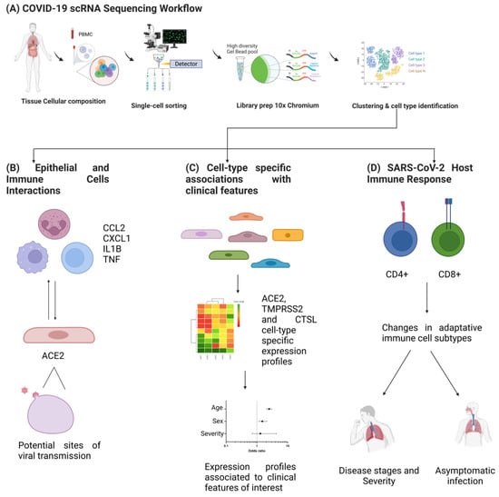 In recent months, single-cell RNA sequencing (scRNAseq) has been harnessed to further our biological understanding of COVID-19 infection in response to the current global pandemic. The scRNAseq method reveals complex and rare cell populations, uncovers regulatory relationships between genes, and tracks the trajectories of distinct cell lineages in development []. These procedures began with single-cell qPCR, performed for the first time on a small number of genes. This was followed by a jump to ~1000 cells that could be analyzed in large-scale studies using integrated fluidic circuits [,]. The most common approach is to use microscopic droplets to isolate many cells and then sequence the libraries relatively shallowly. To identify which cell a given transcript came from, the use of cellular barcodes has increased throughput even further to hundreds of thousands of cells, with the latest developments in spatial methods integrating the spatial location of transcriptomic information within tissue sections []. This high-throughput, low-depth paradigm is typical for experiments using the popular 10X Genomics Chromium platform [,]. This platform is currently able to detect 500–1500 genes per primary cell []. Thus, scRNAseq has provided information on the coordinated response to SARS-CoV2 viral infections at the single-cell level, making this technology an important tool for the identification of new biomarkers for the diagnosis and prognosis of SARS-CoV-2 infections.