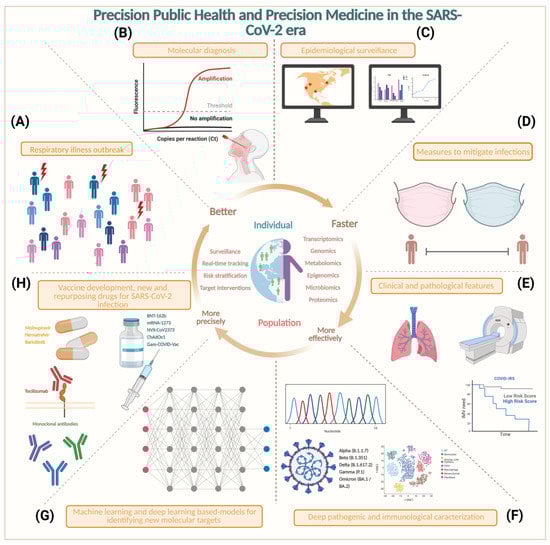 Precision public health and precision medicine in the SARS-CoV-2 era. Conceptual framework showing the integrated relevance of PPH and PM in response to the emergence of the COVID-19 pandemic. (A) Respiratory illness outbreak. Cases of a new respiratory illness began to increase. (B) Molecular diagnosis. Access to accurate tests allowed the confirmation of cases, and RT–qPCR is the gold standard (sensitivity 93% and specificity 100%) [,]. (C) Epidemiological surveillance. Clinical and population data are integrated by the epidemiological surveillance centers of the region. (D) Measures to mitigate infections. Social distancing and mask use are implemented to reduce contagions. (E) Clinical and pathological features. Eventually, with the increase in the number of cases, it is possible to build a clinical and epidemiological profile, identifying risk factors and prognostic tools []. (F) Deep pathogenic and immunological characterization. In an approach driven by technological development, it was possible to perform a molecular characterization of the viral agent and to establish its infectious nature, as well as the susceptibilities of populations in cellular, transcriptomic, genomic, and epigenomic approaches []. (G) Machine learning (ML)- and deep learning (DL)-based models for identifying new molecular targets. The complementary method to conventional health care has been implemented based on AI such as ML and DL to identify patterns of susceptibility and potential targets for drug development and vaccine development []. (H) Vaccine development and new and repurposed drugs for SARS-CoV-2 infection. Ultimately, with the advent of vaccines [] and new drugs [,] useful against COVID-19, they open the door to evaluating their efficacy on an ongoing basis with the goal of targeting the right intervention to the right population at the right time.