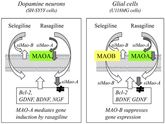 - Inaba-Hasegawa, K.; Shamoto-Nagai, M.; Maruyama, W.; Naoi, M. Type B and A monoamine oxidase and their inhibitors regulate the gene induction of Bcl-2 and neurotrophic factors in human glioblastoma U118MG cells: Different signal pathways for neuroprotection by selegiline and rasagiline. J. Neural Transm. 2017, 124, 1055–1066. [Google Scholar] [CrossRef]