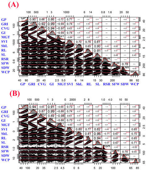 Correlation matrix of germination and seedling growth parameters under (A) control and (B) salinity conditions (150 mM NaCl). The distribution of each trait is shown on the diagonal. The bivariate scatter plots with a fitted line are displayed on the bottom of the diagonal, and the correlation coefficients plus the significance level as stars are shown on the top of the diagonal. *, **, *** are significant, highly significant, and very highly significant at 0.1, 0.05, 0.01, and 0.001 probability level, respectively. Trait abbreviations are given in Table 1 footnote.