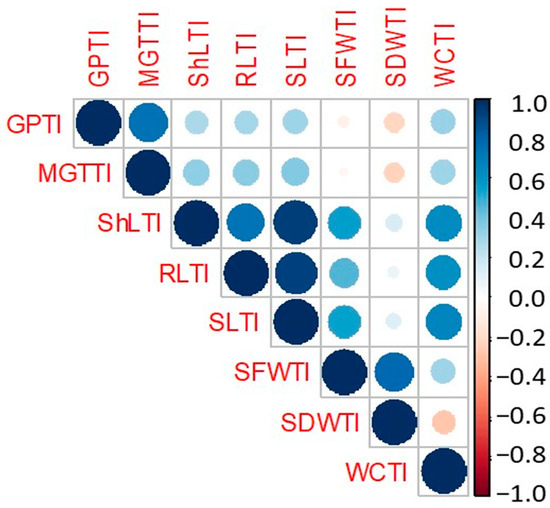 A Pearson correlation coefficients matrix was calculated among the eight salinity tolerance indices (Figure 2). GPTI was positively and highly significantly correlated with MGTTI, ShLTI, RLTI, and SLTI. In addition, WCTI was associated positively and highly significantly with all salinity tolerance indices except for SDWTI, which was negative.