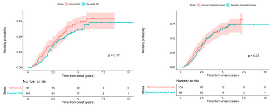 Next, we analyzed the patient’s death probability from the onset of symptoms based on whether the CK and cholesterol values were high or normal, and we did not find statistically significant differences (p = 0.17 and 0.75, respectively). Figure 2 (Left) and Table 4 show the results for CK; Figure 2 (Right) and Table 5 for cholesterol.