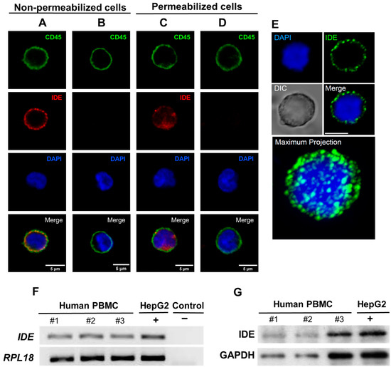 IDE expression in human peripheral blood mononuclear cells. (A) Representative fluorescence microscopy images of an IDE signal obtained with confocal microscopy in non-permeabilized human PBMCs. (B) Control experiments without the primary antibody anti-IDE in non-permeabilized cells. Calibration bar: 5 µm. (C) Representative image showing the specificity of IDE staining in permeabilized PBMCs. (D) Control experiments without the primary antibody anti-IDE in permeabilized cells. Calibration bar: 5 µm. (E) Representative image showing the maximal projection of a Z-stack. (F) IDE expression levels. mRNA was extracted from three healthy subjects (#1, #2, and #3), amplified, and resolved in an agarose gel, as described in the methods section, with human hepatocytes as a positive control (HepG2 cell line). As a negative control, PCRs were run without a cDNA template. Human RPL18 was used as a housekeeping gene. (G) IDE expression levels. The total proteins were extracted from three healthy subjects (#1, #2, and #3) and subjected to Western blot analyses, as described in the methods section, with human hepatocytes as a positive control (HepG2 cell line). GAPDH was used as a loading control.