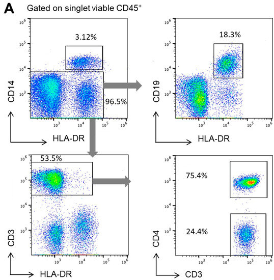 The cells were acquired on a Galios cytometer (Beckman Coulter, Brea, CA, USA). In all cases, the results were analyzed using FlowJow (version 10.1, Ashland, OR, USA). All cells were analyzed within singlet viable CD45+ cells. Positive and negative gatings were set by the fluorescence minus one (FMO) method.