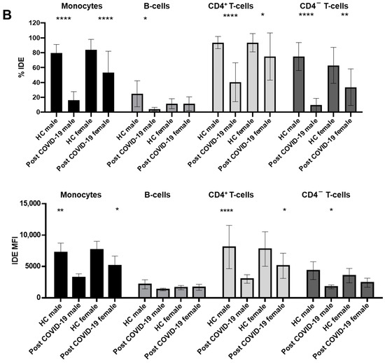 Although age did not affect IDE surface expression in the post-COVID-19 patients, its expression was definitively affected by the gender of the patients (Figure 4A). Hence, IDE surface expression was much higher on the monocytes and CD4+ T-cells (both as percentages and MFIs), and partially on the CD4− T-cells (only as percentages), from female post-COVID-19 patients compared to their male counterparts (Figure 4A).