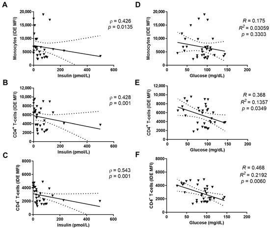 Glucose and insulin levels associated with IDE surface expression in human PBMCs from COVID-19 and post-COVID-19 patients. Bivariate analyses were performed using data from COVID-19 and post-COVID-19 patients. Correlations are shown between insulin and monocytes (A), CD4+ T-cells (B), and CD4− T-cells (C). The Spearman’s correlation (ρ) and the statistical significance (p) are indicated in Figure 5. Correlations are shown between glucose and monocytes (D), CD4+ T-cells (E), and CD4− T-cells (F). The R2 and the statistical significance (p) are indicated.