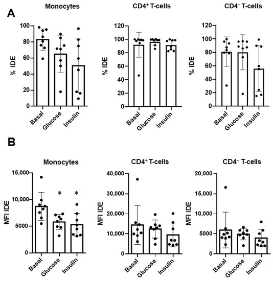 IDE surface expression on monocytes is modulated by glucose and insulin. Peripheral blood mononuclear cells from healthy controls were ex vivo cultured in resting conditions (basal), in the presence of glucose (22 mM), or in the presence of insulin (2500 pmol/L). IDE expression, determined both as a percentage (A) and as the median fluorescence index (MFI) (B) on monocytes, B-cells CD4+ T-cells, and CD4− T-cells, was assessed as in Figure 2. One-way ANOVA repeated measures with a Dunnet correction were applied following ad hoc comparisons to the basal culture. * p < 0.05.
