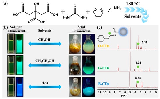Solid fluorescent CDs were prepared by a one-step solvothermal method using citric acid as a carbon source, urea as a nitrogen source and phenylethylamine as a co-carbonization agent. We consider that the phenylethyl structure is brought to the CD surface through the reaction between the carboxyl group on citric acid and the amino group on phenylethylamine to physically separate the CDs, inhibit the fluorescence quenching caused by the aggregation of CDs, and realize solid fluorescence of CDs. Firstly, in order to verify this idea, we selected reaction systems with and without phenylethylamine, respectively, and prepared two groups of CDs in water, in which the CDs prepared without phenylethylamine could not display solid fluorescence (Figure S1). Therefore, we chose phenylethylamine as the reaction system of the co-carbonation agent. Through a large number of solvent regulation experiments, methanol, ethanol and water as reaction solvents were found to enable the preparation of multicolour solid fluorescent CDs. The resulting CDs show bright orange (O-CDs), green (G-CDs) and blue (B-CDs) fluorescence in the solid state under UV light (Figure 1a,b and Table S1). The CDs were characterized by 1H-NMR, as shown in Figure 1c. The NMR data show that the signal of the H (green mark) on the α-carbon is observed in the three CDs. In addition, the three CDs show the NMR signal of the H on the benzene structure between 7 and 8, which also means that through the chemical reaction between the carboxyl group of citric acid and the amino group of phenylethylamine, the phenylethyl group is successfully linked to the surface of the CDs.