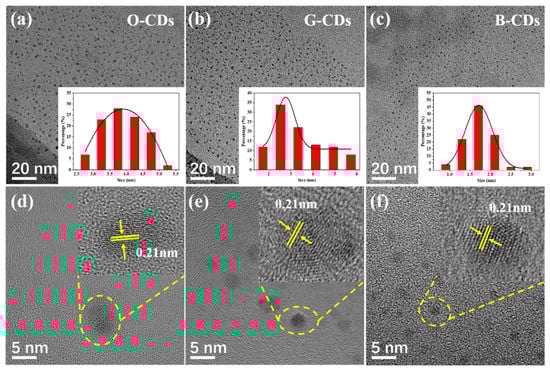 The O-CDs, G-CDs and B-CDs were characterized by transmission electron microscopy (TEM), as shown in Figure 2. We can clearly see that the CDs exhibit a uniform spherical particle shape and good monodispersity. The average particle sizes of O-CDs, G-CDs and B-CDs are 3.75 ± 0.40 nm, 2.72 ± 0.51 nm and 1.75 ± 0.14 nm, respectively, by measuring the particle sizes of 120 CD particles in TEM images, and the particle size of the CDs is positively correlated with the fluorescence. With increasing particle size of the CDs, the CD fluorescence redshifts, and the quantum size effect may be one of the factors leading to the fluorescence difference of the CDs. Figure 2d–f shows high-resolution TEM (HRTEM) images of O-CDs, G-CDs and B-CDs, further showing 2D lattice fringes of the CDs with a lattice spacing of 0.21 nm, close to the (100) diffraction plane of graphite carbon, indicating that the synthesized CDs crystallized well [,,,].