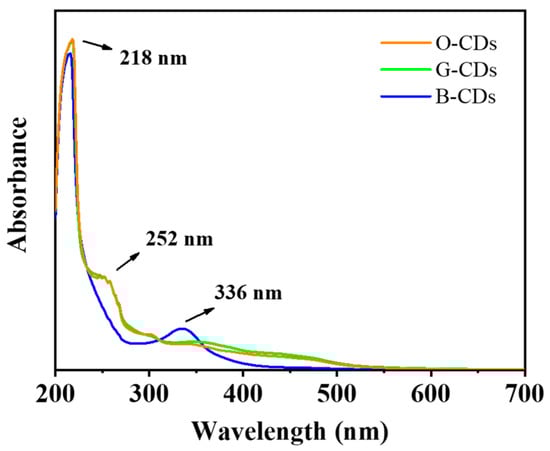 UV—visible absorption spectra of O-CDs, G-CDs and B-CDs in ethanol solution were obtained. As shown in Figure 3, in addition to common ultraviolet absorption near 210 nm, the three CDs have different independent absorption peaks. The absorption peaks of O-CDs and G-CDs at approximately 250 nm are the significant absorptions due to the intrinsic state (π–π*) transition of the aromatic sp2 domain (C=C). In addition, the absorption band of B-CDs at 345 nm is caused by the n–π* transition of C=O/C=N-related bonds [,,,]. Meanwhile, the absorption of O-CDs and G-CDs at 400–500 nm is caused by the surface functional groups of the CDs.