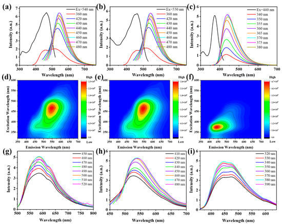 (a–c) Excitation, emission and (d–f) 3D spectra of O-CDs, G-CDs and B-CDs in ethanol solution (c = 0.1 mg/mL). (g–i) PL spectra of O-CDs, G-CDs and B-CDs in the solid state.