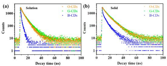 Fluorescence lifetime characterization of O-CDs, G-CDs and B-CDs in ethanol solution (c = 0.1 mg/mL) (a) and in the solid state (b).