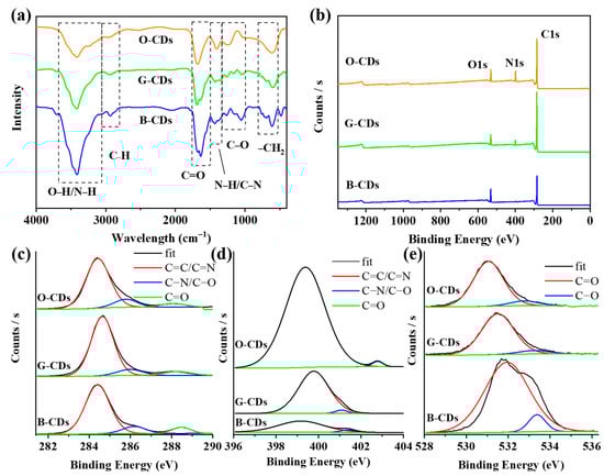 The surface composition of CDs was characterized by Fourier transform infrared (FTIR) spectroscopy. According to the FTIR results (Figure 6a), the strong characteristic peaks of O-CDs, G-CDs and B-CDs at approximately 3417 cm−1 show that there are abundant O-H/N-H groups, and the absorption peaks at 2937 cm−1 may be caused by C-H bond vibrations. This indicates that through the reaction between the carboxyl group of citric acid and the amino group of phenylethylamine, the alkyl structure is successfully connected to the surface of CDs, thus blocking the self-quenching of the solid-state fluorescence of CDs []. In addition, other vibrational bands corresponding to functional groups such as C=O, N–H, C–N, C–O and –CH2 and other chemical bonds are also observed, corresponding to five characteristic absorption peaks at 1680, 1405, 1268, 1046 and 602 cm−1, respectively [,].