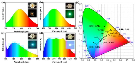 (a–d) EL emission spectra of the (a) O-LED, (b) G-LED, (c) B-LED and (d) WLED. The insets show optical images of the LEDs in the “off” (top) and “on” (bottom) states. Note: The color change in the picture corresponds to the dispersion spectrum of visible light at the corresponding wavelength. (e) CIE 1931 diagram containing the colour coordinates of the O-LED, G-LED, B-LED and WLED devices.