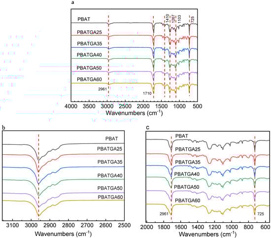 (a) ATR-FTIR spectra of PBATGAs; (b) enlargement of 2500–3100 cm−1; (c) enlargement of 600–2500 cm−1.
