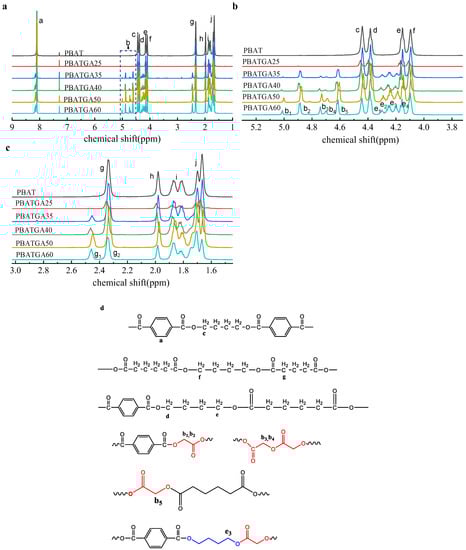 (a) 1H NMR spectra of PBATGAs; (b) enlargement of chemical shift 4.0–5.2 ppm; (c) enlargement of chemical shift 1.6–3.0 ppm; and (d) chain structures of the PBATGAs.