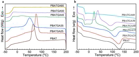 In the cooling scan (Figure 3a), Tc and ΔHc of PBAT were 64 °C and 35.53 J/g, respectively. PBATGA25 showed that the crystallization peaks around 77 °C and the exothermic enthalpy of crystallization is 21.47 J/g, relative to an increase of 13 °C compared to PBAT. Meanwhile, a faster crystallization rate can be observed because it has a smaller value of Topset-Tc, which can be used as a judgment for the overall rate of crystallization. This value was about 11.98 °C when the GA content was 25%, which was lower than that of neat PBAT (15.55 °C), indicating that the proper introduction of glycolic acid into PBAT could increase its crystallization temperature and improve its crystallization rate; this can be ascribed to the polarity between GA molecular chains being relatively strong, which enhances the intermolecular force, making the intermolecular arrangement more orderly and easier to crystallize []. However, when further raising the molar content of GA to 35%, the crystallization peak temperature of the copolyester dropped to 50.52 °C, which was 13.89 °C lower than that of PBAT. When the molar content of glycolic acid was 40–60%, there was no crystallization peak in the DSC spectrum of the copolyester, indicating that the addition of glycolic acid destroyed the crystallization of PBAT and made the copolyester show an amorphous state. It was noticed that variations of GA units influenced the crystallization of PBAT significantly. A small quantity of GA units can improve the crystallization of PBAT. A mass of GA units can inhibit the crystallization of PBAT. In summary, PBATGAs can be classified into three types depending on their crystallization behavior: PBATGA25 (good), PBSGA30–PBATGA40 (middle), and PBATGA50–PBATGA60 (weak). In the second heating scan (Figure 3b), Tm and ΔHm of PBAT were 129.9 °C and 21.02 J/g, respectively. It can be seen that the addition of 40–50% glycolic acid makes the copolyester show cold crystallization behavior. Tm decreased with increasing nGA, the melting point, and melting enthalpy of PBATGAs from 129.4 °C to 90.29 °C and from 31.57 to 13.07 J/g, respectively; indicating that the lamellar thickness was suppressed by the GA units. However, Tg showed the opposite trend (−27.02 °C to −18.05 °C).