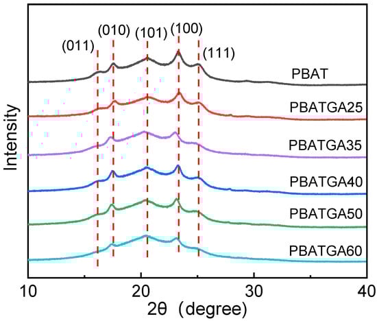 We further explored the crystallization properties of PBAGAs copolyester by using the WAXD device. The WAXD curves of PBATGAs were shown in Figure 4. The diffraction peaks of PBAT and PBATGAs were at 16.36° (011), 17.55° (010), 20.50° (101), 23.25° (100), and 25.00° (111), respectively. The intensity of crystalline diffraction peaks gradually weakens with the increase in GA content, which suggests that the content of crystalline structure in PBATGAs decreases. It shows that the addition of glycolic acid will reduce the regularity of the main chain of PBAT, thereby reducing the crystallinity of the copolyester. In addition, although the crystal diffraction peak intensities of the PBATGAs are slightly different, the position of the crystal diffraction peak remains unchanged, which indicates that the addition of glycolic acid will not affect the formation of the PBAT crystal region and crystal structure.