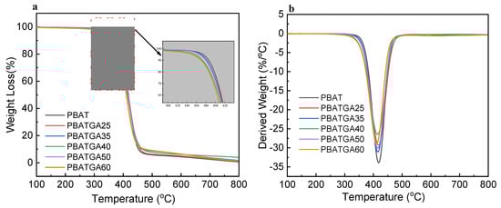As we all know, a copolyester with good thermal stability is one of the keys to adapt to different molding processes. The thermal stabilities of PBATGAs in N2 atmosphere were evaluated by TG analysis. Figure 5a showed the thermal decomposition curves for PBATGAs and Figure 5b showed the DTG–T curves for PBATGAs, the corresponding data were summarized in Table 2. The relevant data showed that PBAT had higher thermal decomposition temperature than PBATGAs, the temperatures corresponding to 5% weight loss of the series samples (T5%) decreased from 376 °C to 350 °C, and the maximum decomposition temperature (Tdmax) decreased from 418 °C to 411 °C with the increase in the GA segment. Thus, all PBATGAs will not decompose when the processing temperature is less than 300 °C. This ensures that the copolyester has good thermal stability during processing.