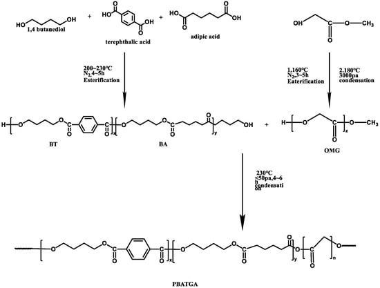 1,4 Butanediol (BDO) was bought from Sinopharm Chemical Reagent Co., Ltd. (colorless transparent liquid, purity ≥ 99%, Shanghai, China). Terephthalic acid (TPA) was bought from Aladdin Chemicals Co. (white powder, purity ≥ 99%, Shanghai, China). Adipic acid (AA) was obtained from Shanghai Lingfeng Chemical Reagent Co., Ltd. (white powder, purity ≥ 99.5%, Shanghai, China). Methyl glycolate (MG) was purchased from Aladdin Chemicals Co. (colorless transparent liquid, purity ≥ 98%, Shanghai, China). Antimony trioxide (Sb2O3) (AR grade) was bought from Aladdin Chemicals Co. (purity ≥ 99.5%, Shanghai, China). Catalyst CAT-2019 (light yellow transparent viscous liquid) was supplied from the College of Advanced Materials Engineering, Jiaxing Nanhu University. Polymethyl glycolate (light yellow powder) was made in our laboratory. Tetrahydrofuran (AR grade) was purchased from Shanghai Lingfeng Chemical Reagent Co., Ltd. All of these reagents were used directly as received without further purification.
