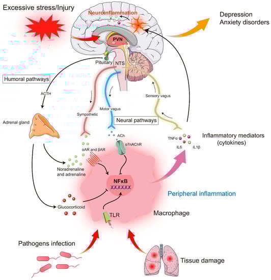 During injury, disease, or infection by bacteria and viruses, the immune system is activated, and plenty of pro-inflammatory cytokines are produced and released by immune cells such as macrophages and T and B lymphocytes, which act as mediators of the innate immune response. Notably, a growing body of studies have shown that psychological or emotional stress can also trigger the activation of the peripheral immune system, leading to the release of multiple pro-inflammatory cytokines [37] (Figure 1). Psychological stress might alter immune function via the direct innervation of lymphatic tissue through the rapid activation of the hypothalamic–pituitary–adrenal (HPA) axis and the sympathetic–adrenal–medullary (SAM) system, two major components involved in stress coping [33,37,38]. In response to psychological stress, the hypothalamus secretes corticotropin-releasing hormone (CRH) to initiate a stress response. Higher levels of CRH cause the pituitary to release the adrenocorticotropic hormone, which subsequently triggers the synthesis and release of glucocorticoids (corticosterone in rodents, cortisol in humans) in the adrenal glands. In addition, neurons in the paraventricular nucleus of the hypothalamus project heavily to the locus coeruleus (LC), also known as the norepinephrine centers in the brainstem. The LC sends direct projections to the autonomic nervous system in the spinal cord, including sympathetic and parasympathetic preganglionic neurons, which increase sympathetic activity and decrease parasympathetic activity by activating adrenergic and muscarinic receptors [39]. The sympathetic nervous system is activated and stimulates adrenal medulla cells to release epinephrine and norepinephrine into the blood, which modulates the release of cytokines such as TNF-α and IL-6 by acting on α- and β-adrenergic receptors on immune cells (macrophages) and induces peripheral immune responses [40]. The activation of the afferent vagus nerve conveys peripheral inflammatory signals to the brain and then activates the anti-inflammatory efferent vagus nerve to suppress pro-inflammatory cytokine release and inhibit inflammation, known as “the cholinergic anti-inflammatory pathway” [41,42,43].