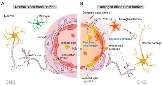 Increased periphery inflammation leads to disruption of the blood–brain barrier (BBB). (A) In healthy BBB, tight junctions between brain endothelial cells form the primary physical barrier that prevents the entry of large and potentially toxic molecules into the brain. Endothelial cells are encompassed by basal lamina, pericytes, and astrocytic endfeet. Pericytes and astrocytic endfeet interact closely with the endothelial cells and can help maintain BBB integrity. (B) Inflammation, caused by an infection or virus, can lead to immune cell infiltration. Increased periphery inflammation has a detrimental effect on the integrity of the BBB at various levels, including endothelial cell degradation or shrinkage, altered paracellular transport pathways via loss of tight junction proteins, as well as dysfunction of pericytes and astrocytes. Loss of BBB integrity makes it more permeable, allowing immune cells and inflammatory cytokines to enter the brain parenchyma, which in turn leads to microglial activation to induce neuroinflammation. Neurons may experience demyelination or become damaged.