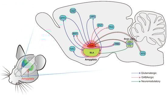 The LA is traditionally known as the primary target of multimodal sensory information from the thalamus and cortex [83,84]. Upon receiving the information, the LA relays the integrated signal to the BA by its multi-axon lateral branches onto both glutamatergic projection neurons and GABAergic interneurons in the BA. This integrated information is then relayed to the CeA through dense efferent fibers. Notably, both the BLA and CeA receive dense projections and also have intensive projections to downstream brain regions, which are implicated in a host of behavioral and physiological responses, including anxiety, depression, fear, and other stress responses (Figure 3, refer to the review [76]).