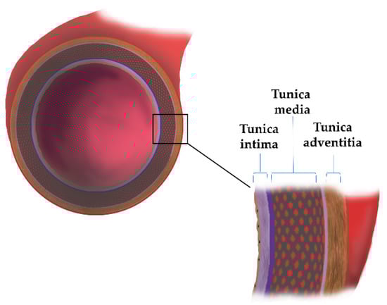 The circulatory system, which integrates structurally and functionally in our body, consists of two major components, the blood vessels (arteries and veins) and the heart. Blood vessels as tubes form pathways for blood flow, whereas the heart is a muscle that, by pumping the blood, keeps it moving. The arteries differ due to their anatomical structure and physiological properties, forming aortas, main arteries, arterioles, and arterial capillaries and, subsequently, veins with increasing diameters when close to the heart. The human aorta is the largest conducting artery, whose primary function is blood transport and flow equalization. The aorta is an artery of the elastic type, which consists of three main layers: tunica intima, tunica media, and tunica adventitia (Figure 1). Furthermore, the tunica adventitia is separated from the tunica media by the external elastic lamina, and the tunica intima is separated from the tunica media by the internal elastic lamina. The major cellular components of the aorta wall are endothelial cells (ECs), smooth muscle cells (SMCs), and fibroblasts (FBs). Additionally, the wall is made of ECM proteins specific for each layer (Table 1).