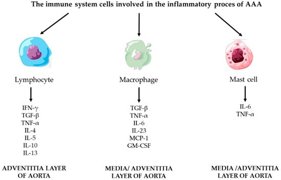 The inflammatory process that arises in the AAA wall is a key factor in the formation of an aneurysm. The inflammation involves a number of cells of the immune system. The most important cells are: lymphocytes, macrophages, and mast cells. These cells penetrate into the tissues through the layers of the aorta: intima, media, and adventitia. The cells of the immune system that participate in the immune response are shown in Figure 3.