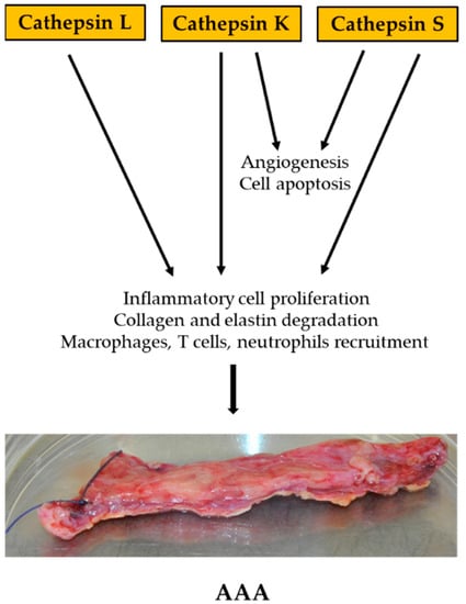 - Qin, Y.; Cao, X.; Yang, Y.; Shi, G.-P. Cysteine protease cathepsins and matrix metalloproteinases in the development of abdominal aortic aneurysms. Future Cardiol. 2013, 9, 89–103. [Google Scholar] [CrossRef] [PubMed]