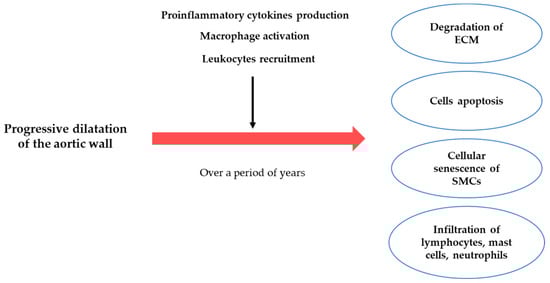The pathogenesis of AAA is a multistage process involving several biological steps and risk factors. It seems that no specific individual molecular mechanism is responsible for the formation of an AAA. It is known that the degradation of the ECM negatively affects the functioning of the aorta. The ECM is a skeleton of the aortic wall responsible for the transmission of muscle fiber forces and for its maintenance and repair. Abnormal remodeling of the vessel wall under the pathological mechanical forces exerted by blood pressure adversely affects the expansion of the vessel wall, contributes to the formation of the AAA, or leads to rupture.