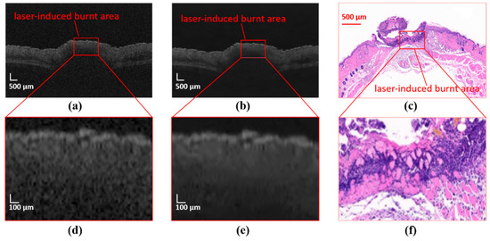 OCT image and label. (a) Original OCT image and (d) corresponding enlarged ROI. (b) Preprocessed OCT images and (e) corresponding enlarged ROI. (c) Histological sections and (f) corresponding enlarged ROI.