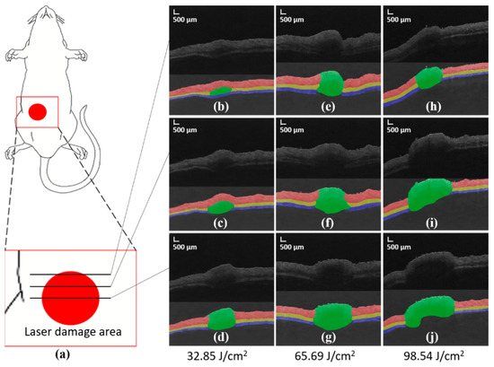 Figure 2b–d,e–g,h–j shows the segmentation results of OCT images damaged by laser radiation duration of 1, 2, and 3 s, respectively. Each image contains two parts, the upper part is the B-Scan image, and the lower part is the segmentation result.Each column of image is from the edge of the damage to the center of the damage from top to bottom. Figure 2b–d shows that the damage caused by the 1 s radiation dose has the smallest damage area and the shallowest depth. The upper dermis at the edge of the injury was not significantly damaged, but the fat layer below the dermis was damaged. In the central area of the injury area, the dermis, fat layer, and muscle layer were significantly damaged. Figure 2e–g shows that the damage area is larger than the one-second radiation dose. The dermis began to be damaged at the edge of the injury areas, and the muscle layer at the lowest layer was also damaged and punctured by laser. Figure 2h–j shows that the damage span of the 3 s radiation dose increased significantly compared with that of the 2 s radiation dose. Given the depth limitation of the OCT imaging system, this can only be judged according to the fracture of the muscle layer, and the laser radiation completely damages the muscle layer. With an increase in the radiation dose, the damaged area expanded and deepened.