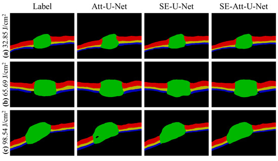 To further enhance the segmentation effect and highlight the details of the damaged edge, the attention mechanism module, SE attention mechanism module, and U-Net structure are combined to enhance the segmentation. A comparison of results from different network models is shown in Figure 3. Figure 3a–c shows the segmentation results of OCT images damaged by radiation doses of 32.85 J/cm2, 65.69 J/cm2, and 98.54 J/cm2 with different neural network models. The training time of 50 epochs is about 40 min for each model. U-net is a little faster than the other methods with more modules.
