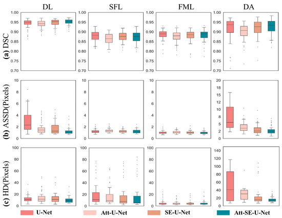 Box diagram of quantitative evaluation results of deep convolutional network models. (a) DSC, (b) ASSD, and (c) HD.