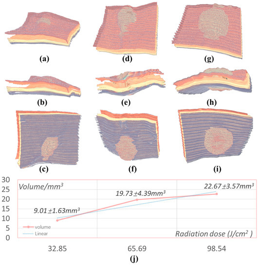 Figure 5d–f shows 3-D reconstruction images of the damaged area of two radiation doses. Figure 5g–i shows the images of three angles of three-dimensional reconstruction of the damaged area of three radiation doses. It can be clearly seen from the 3-D reconstruction images of the damaged skin. With an increase in the number of radiation doses, the volume of the damaged areas also increases. Figure 5j shows statistical results of the volume of the injury area at three different doses. The volume of the injury area corresponding to different radiation doses was 9.01 ± 1.63 mm3, 19.73 ± 4.39 mm3, and 22.67 ± 3.57 mm3, respectively. Hence, the quantitative analysis of laser-induced skin damage is constructed through segmentation using deep convolutional networks and volume calculation using 3-D visualization. A quantitative intelligent evaluation method is proposed to study laser-induced damage and laser biological effects. This method can be used to assist in the screening of skin diseases and skin damage.