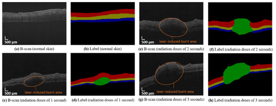 OCT image of mouse skin and manual labeling. (a,c,e,g): OCT images immediately after radiation corresponding to radiation doses of 1, 2, and 3 s, respectively. (b,d,f,h): labels corresponding to images of (a,c,e,g).