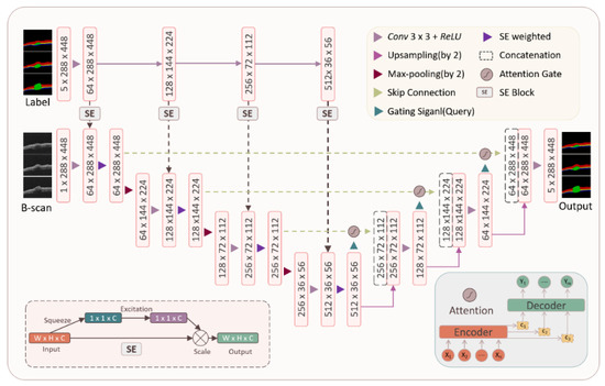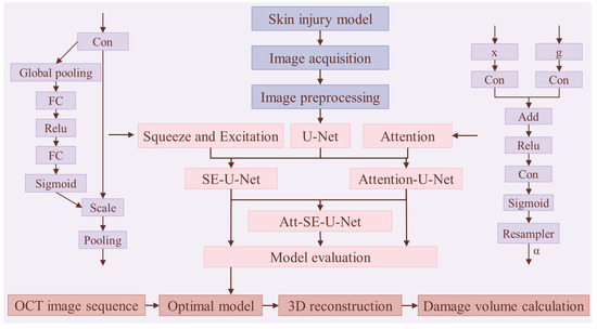 This study uses a U-Net network model combined with the attention [40] and the squeeze-and-excitation [41] attention module to segment mouse skin OCT images into multiple categories. Four networks are used to segment the OCT images: U-Net, Att-U-Net, SE-U-Net, and dual attention mechanism-based U-Net (Att-SE-U-Net) models.