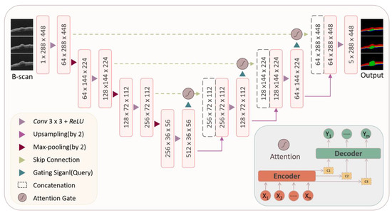 The structure of the attention U-Net model is shown in Figure 9. The left half of the model is the encoder structure, which is composed of a convolution layer and pooling layer and is used to extract the features of different dimensions of the mouse skin OCT image. The right half of the model is the decoder, which is composed of upsampling and a convolution layer. The high-level semantic feature map obtained from the mouse skin OCT image is restored to the original resolution mouse skin OCT image. Furthermore, the skip connection structure is adopted, combined with the feature map obtained in the encoder and the feature map obtained in the decoder, in which the attention mechanism module is inserted. The more abstract OCT image features extracted through multiple convolution layers are combined with the features with higher resolution according to the parameters of the attention module, and finally, the segmentation results are output. The process of inserting the attention module during skip connection is as follows [Equation (1)]: