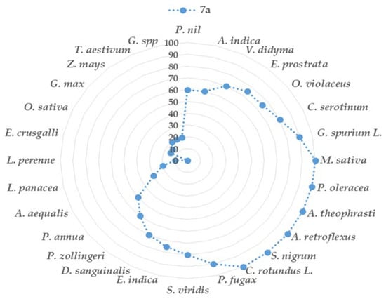3.3.3. Herbicidal Activities Glasshouse Assay against Abutilon theophrasti and Amaranthus retroflexus