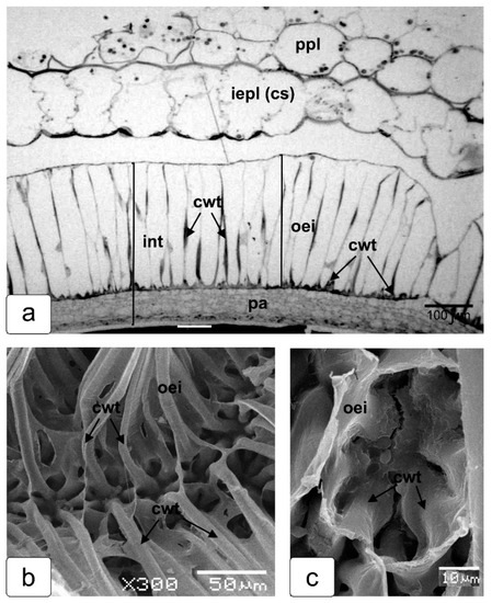 Figure 4c). The epidermis of the protruding placenta tissue develops into the shell of the seed capsule (cs). The outer and inner walls of a thin layer of the epidermal cells of the placental protrusion (iepl) have significant thickenings, which probably provide strength and a kind of independent development of this tissue and the ability to form a capsule (cs). Significant thickening of the cell walls of the outer epidermis of the seed integument (cwt) is also noticeable, and is especially pronounced in the lower part and along the entire length of the cells. These parts of the cell walls of the seed coat are markedly fragmentary thickened (cwt) compared to the outer cell wall (