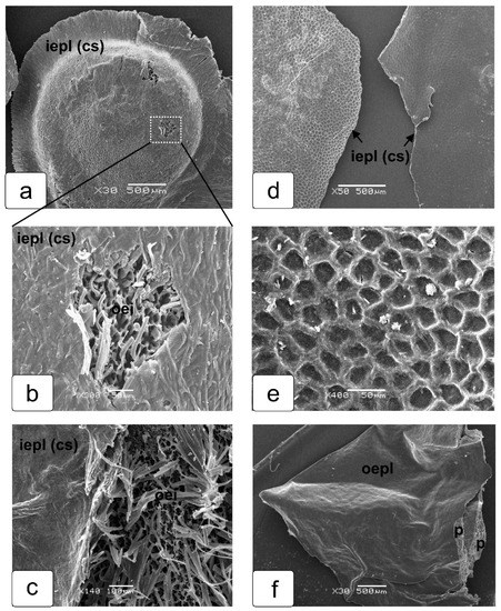 Figure 7e). This indicates that these cells of the epidermis of protrusion of the placental tissue retain their structure and shape, which ensures the integrity of the seed capsule. The outer side of the seed capsule shell is rather smooth (