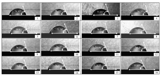 The orthogonal experiment was designed using Design-Express software. According to the orthogonal experiment table, different contact angles were measured, and the results are shown in Table 1 (n = 16).