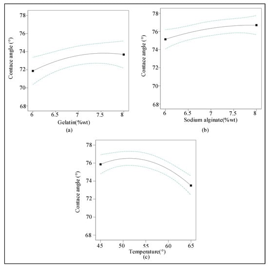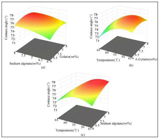 According to the analysis shown in Figure 3, the interaction term (gelatin/alginate) had an effect on the contact angle. The interaction term (gelatin/temperature) and the interaction term (alginate/temperature) had a significant effect on the contact angle and increased first and then decreased with the increasing temperature.