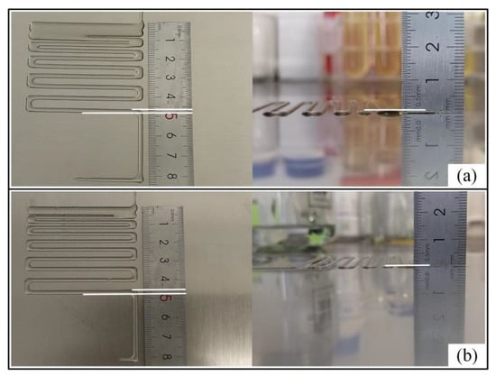 Two groups of gradient lines printed at different concentrations and temperatures. Comparison between the width and height of the gradient line filaments printed from gelatin/alginate/temperature (8–8 wt–55 °C) mixed hydrogel and gelatin/alginate/temperature (7–7 wt%–65 °C) mixed hydrogel. The height and width of the gradient lines were clearly different between the two groups. (a) The contact angle of the hybrid hydrogel was 76°, the width of the printing filament was about 2 mm, and the height was about 0.4 mm. (b) The contact angle of the mixed hydrogel was 73.5°, the width of the printed filament was about 2.5 mm, and the height was about 0.2 mm. As the hydrogel contact angle decreased, the printed filaments gradually became wider, and the height gradually decreased.