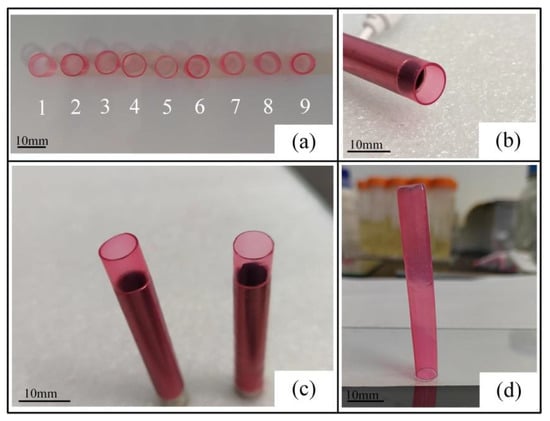 The thickness of the vessel wall changed with the temperature and solution concentration. The wall thickness of the vessel was made easier to visualize by staining; the thicker the wall, the darker the color presented. As shown in Figure 5b,c, the external wall of the nine groups of blood vessels printed in this test was smooth, with a uniform shape and good elastic mechanical support performance. The 80 mm artificial blood vessel with a diameter of 8 mm can still be placed vertically on the surface of the glass plate after it is detached from the screw rod (Figure 5d).