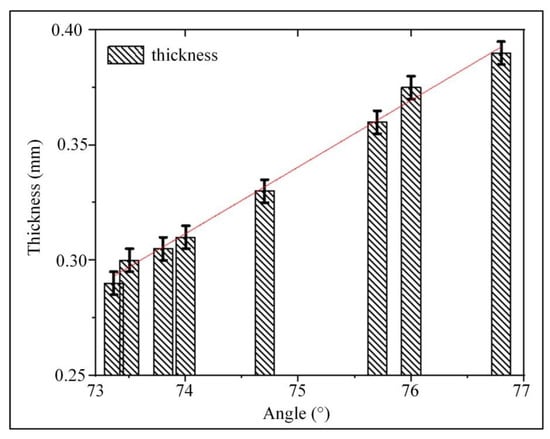 According to Figure 6, the relationship between the contact angle and the wall thickness could be more intuitively reflected (n = 9). With the increase of the contact angle, the wall thickness of the artificial blood vessel gradually became thicker. When the contact angle was 73.36°, the wall thickness of the printed vessel was 0.29 mm. When the contact angle was 76°, the wall thickness gradually increased with the increase of the contact angle, reaching 0.48 mm. It can be demonstrated that there is a clear relationship between the vessel wall thickness and the contact angle of spiral-printed manufactured artificial blood vessels. The experimental results confirmed that changing the contact angle of the material can effectively control the wall thickness of the vascular structure.