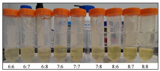 After the sodium alginate and gelatin were completely dissolved, the mixed hydrogel was centrifuged at 3500 r/min for 15 min using a tabletop high-speed centrifuge (purchased from Shanghai Macklin Biochemical Co. Ltd, Shanghai, China) to ensure complete removal of air bubbles and, finally, frozen in the refrigerator. Figure 7 shows the mixed hydrogels with different concentrations. The color of the mixed hydrogel and the gelatin body is light yellow; the higher the concentration of the mixed solution was, the darker the color, and the viscosity increased with the increase of concentration.